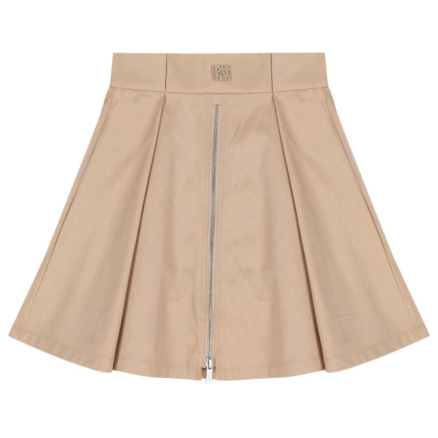 Beige skirt for girls by DKNY. Made from soft cotton blend, it features the brands logo on the front. It fastens with zip on the front and back.