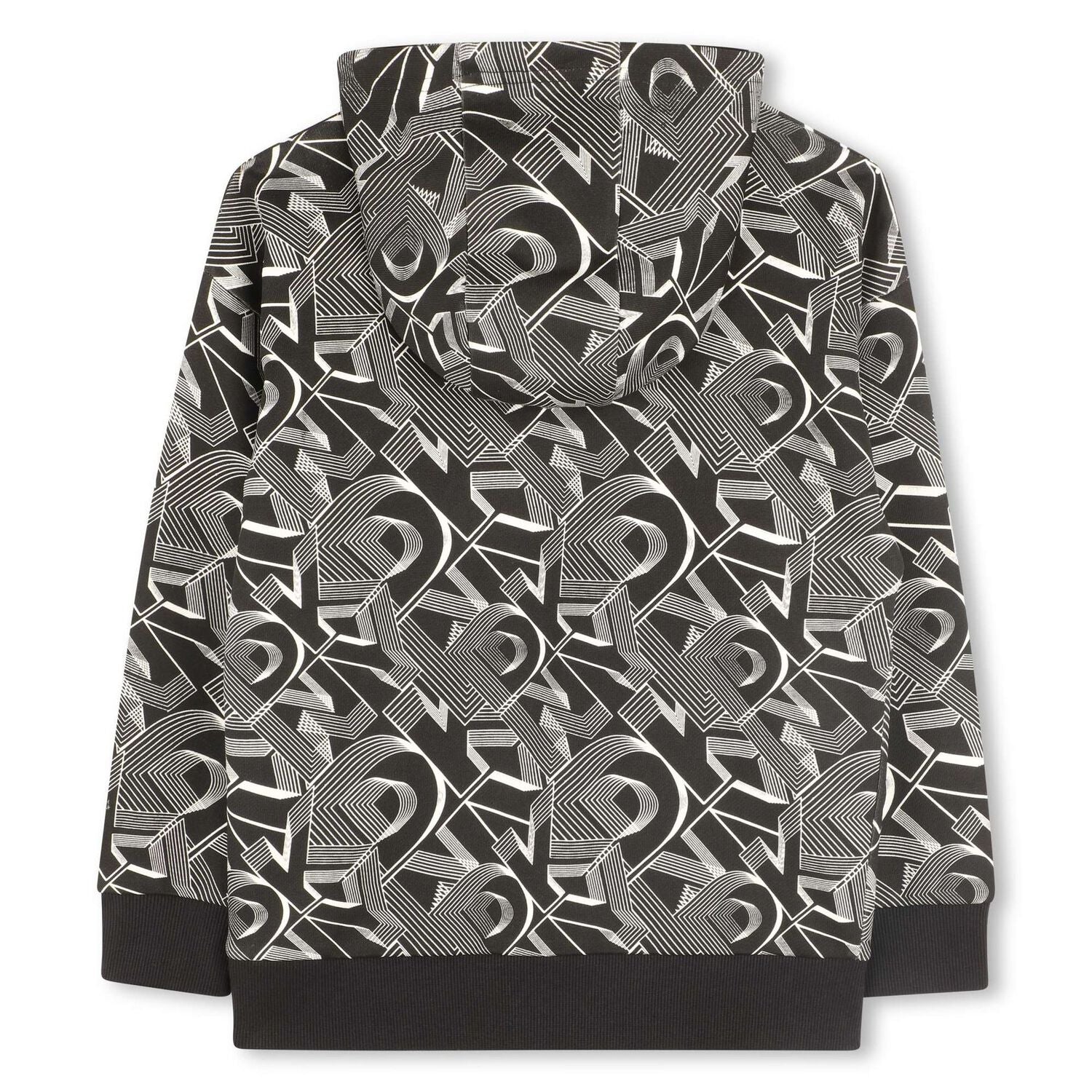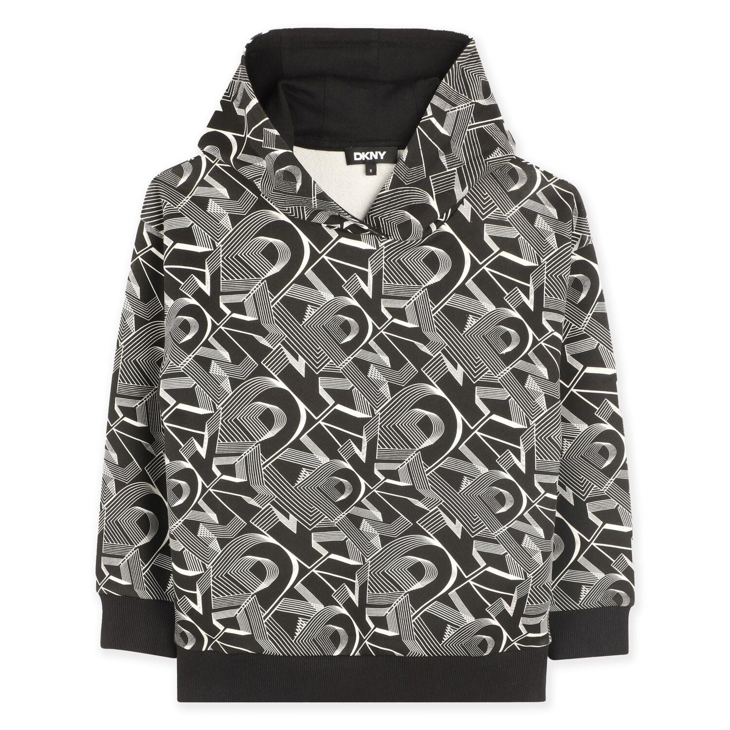 Black And White Hooded Top For Boys By Dkny. Made From Soft Cotton, It Features All-over Logo Printed Pattern, A Hoodie Neck And Ribbed Trims.