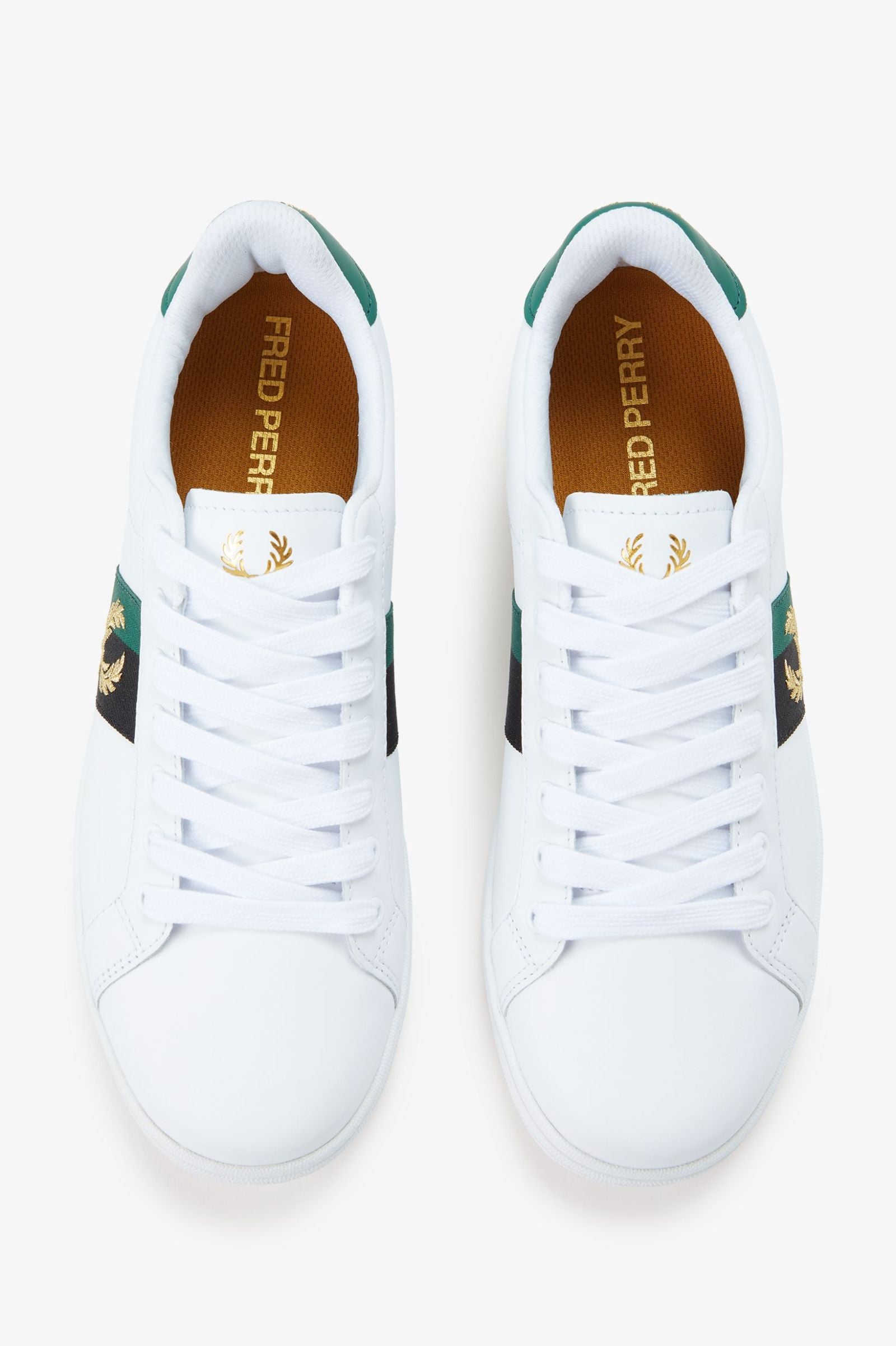 Our B721 Tennis Shoe In Smooth Leather, With Webbing Tape To The Quarter Panel And Metallic Gold Laurel Wreath Logos.