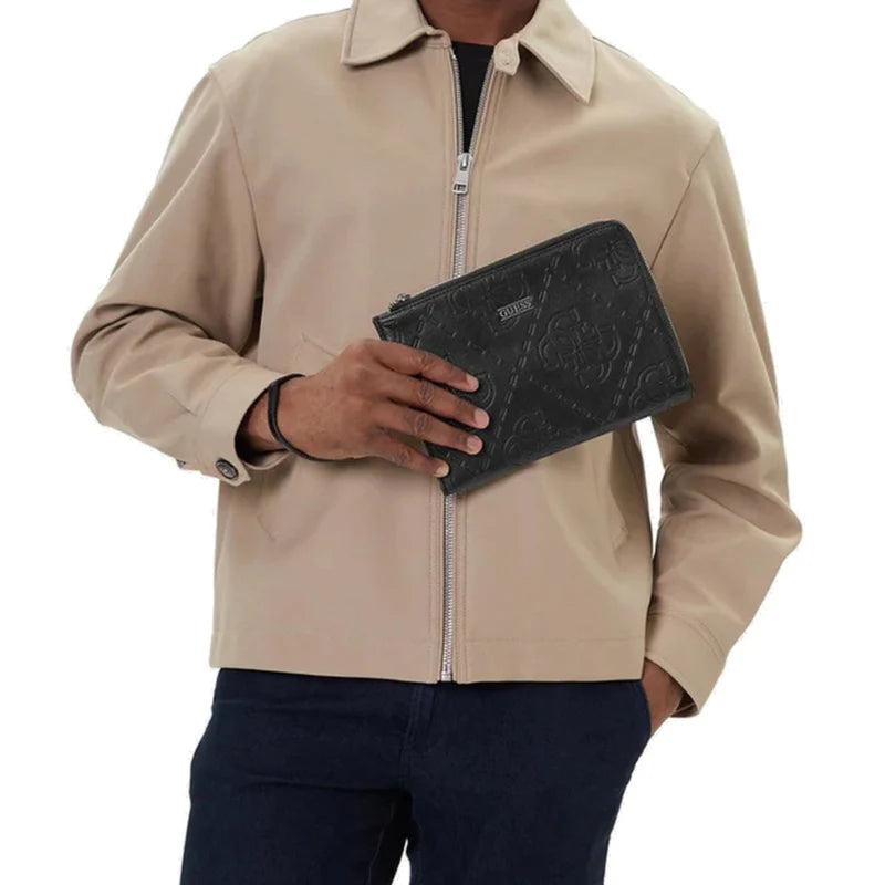 The Guess Boston Line Offers A Clutch Bag Designed To Meet The Needs Of The Modern Man. Made From Coated Canvas Using Recycled Materials, It Combines Elegance With Environmental Responsibility. Its Faux Leather Design And Rigid Construction Ensure Optimal Durability And Effective Protection For Personal Belongings. Featuring A Side Handle For Comfortable Carrying And Dedicated Slots For Two Cards, This Clutch Bag Blends Style, Practicality, And Eco-consciousness To Accompany You On All Your Daily Occasions.