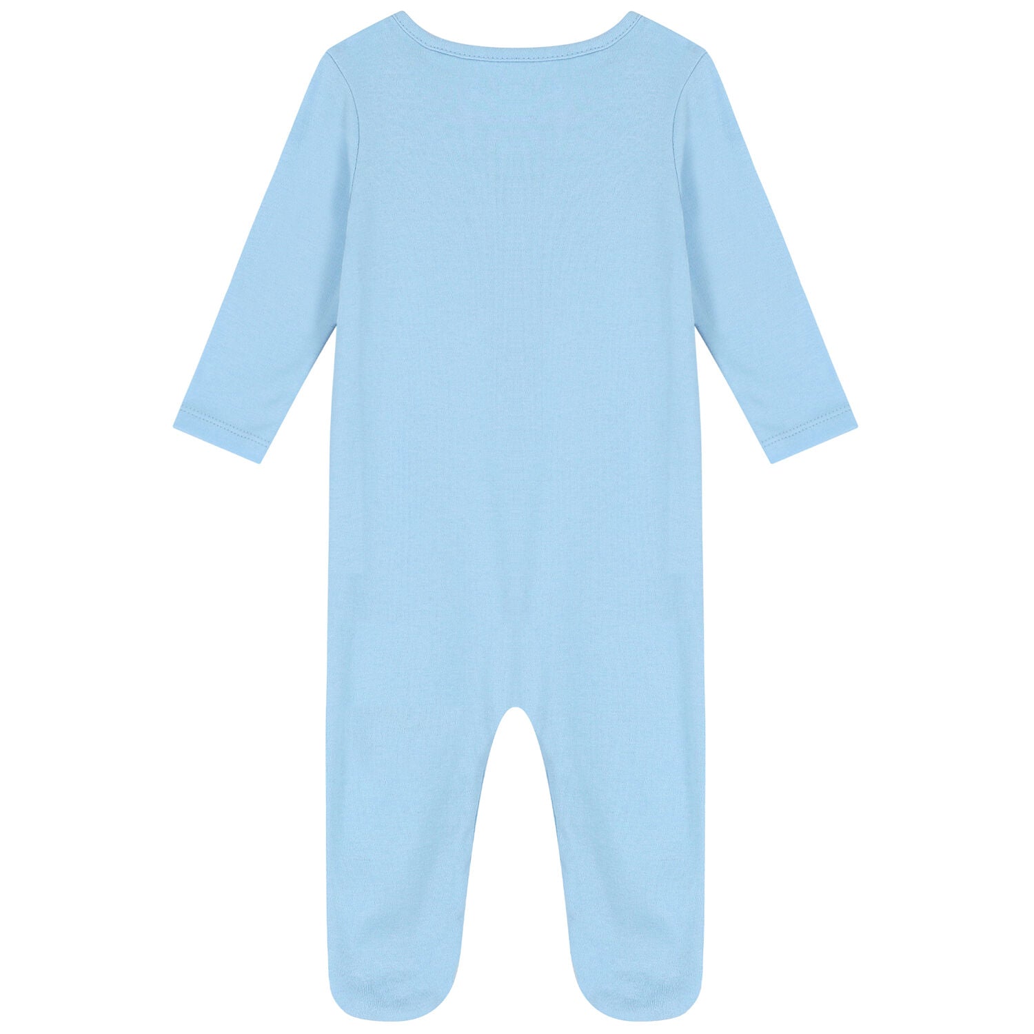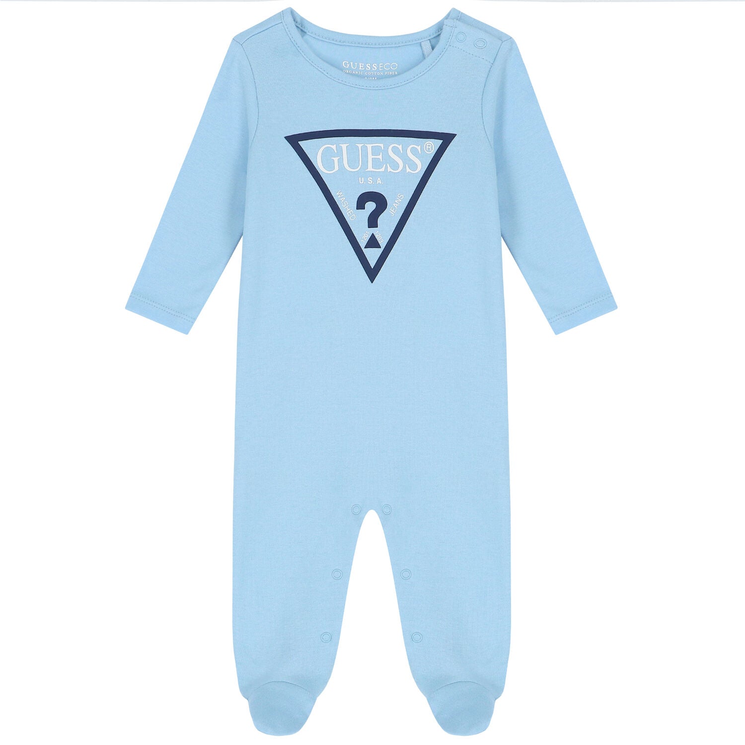 Blue Logo Babygrow For Baby Boys By Guess. Made From Soft Cotton, It Features The Brands Logo Print On The Front. It Fastens With Poppers On One Shoulder And Between Legs For Easy Dressing. It Comes With Branded Tin.