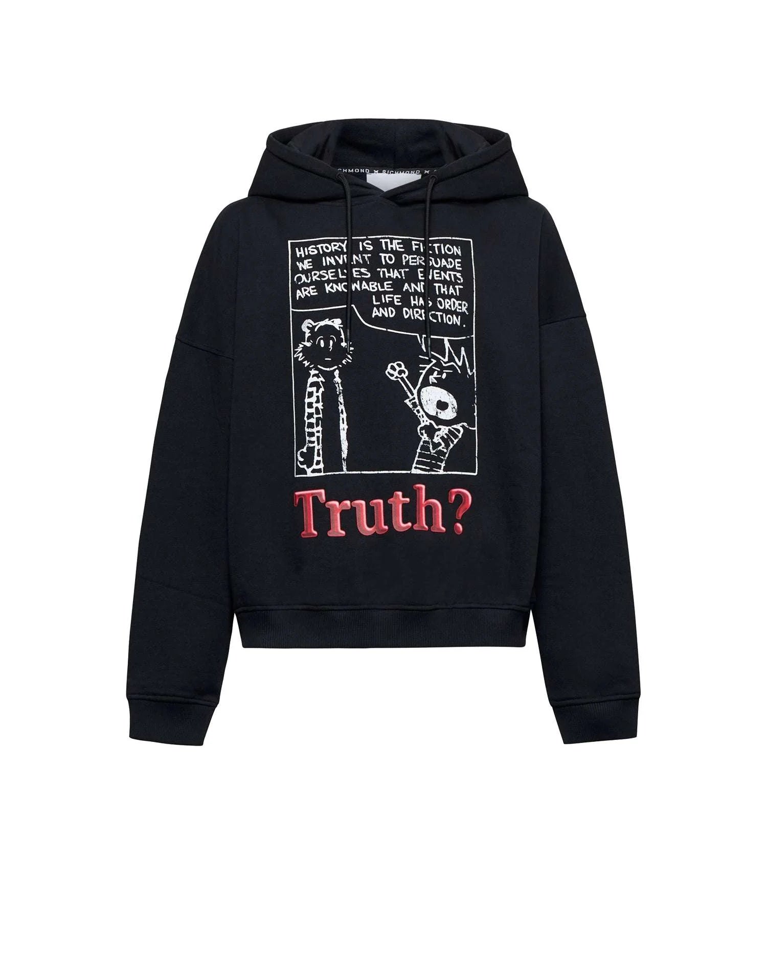 Sweatshirt with a hood with a distinctive graphic design, characterized by a front print with text and comic -style text and illustration and the word "Truth?". A perfect garment for those who love a strong and provocative urban aesthetic, ideal for completing modern metropolitan looks.
