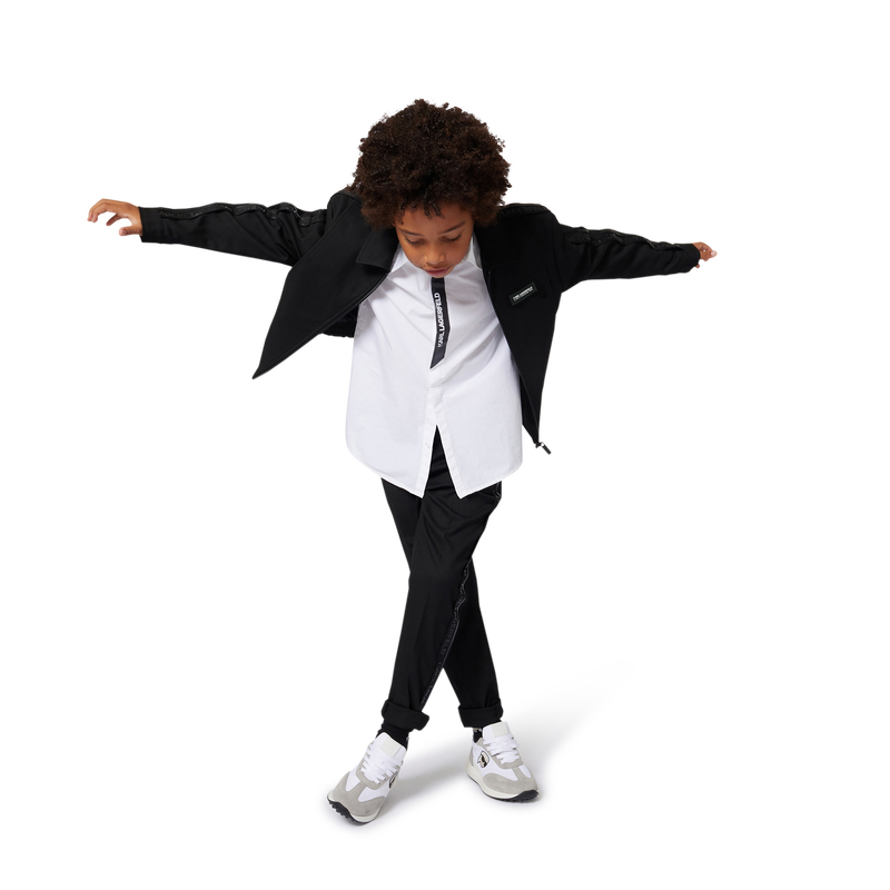 These twill pants combine comfort and elegance, with an elasticated waistband and a front zip and button closure for a perfect fit. Pockets on the sides and back add to the practicality of this model. The KARL LAGERFELD KIDS jacquard stripe on the sides adds a touch of modernity and refinement. A perfect choice for a chic and casual look that is both functional and stylish.