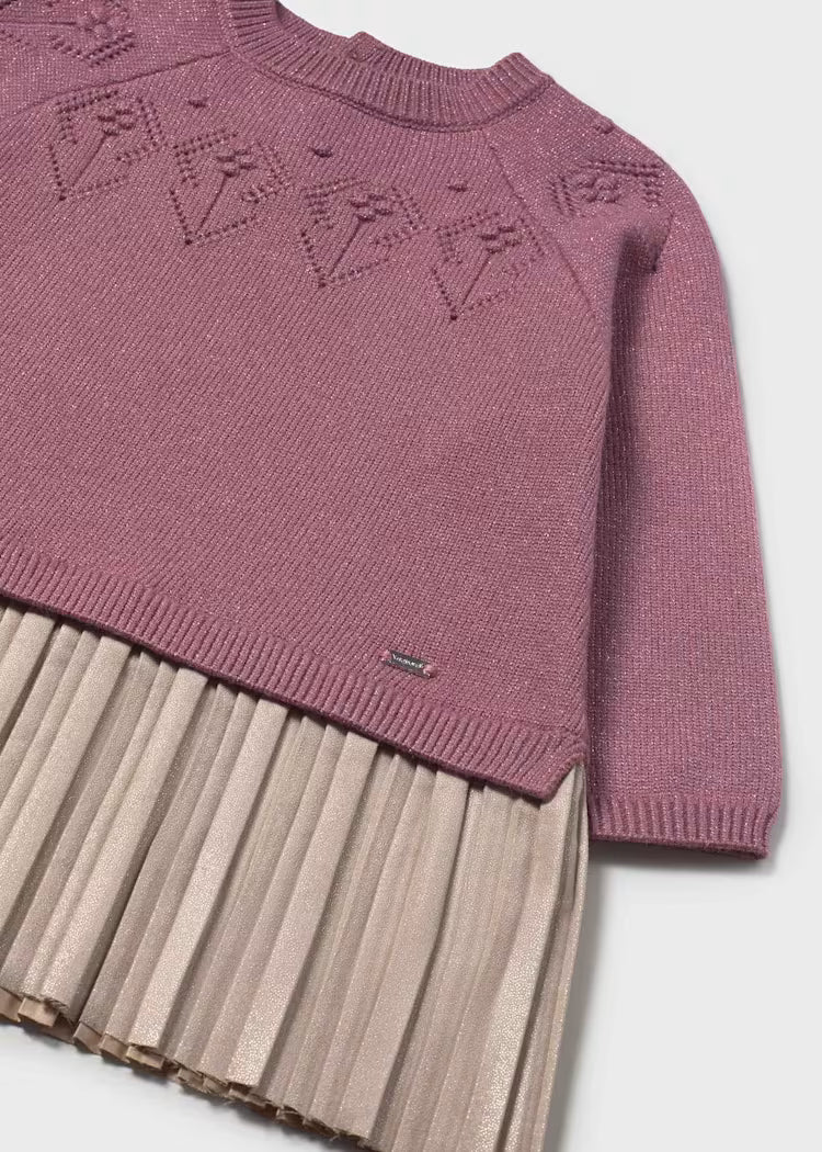 Raglan sleeve dress for baby. Round neckline. Designed with non-detachable jumper. Button fastenings down the back to allow the garment to be put on and taken off easily. Knitted fabric, soft and pleasant to the touch