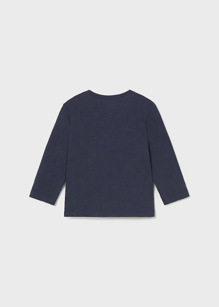 Long sleeved T-shirt for baby. Round neckline. Snap-button fastenings on the shoulder to allow the garment to be put on easily. Made from 100% cotton fabric. Decorative elements: decorative applique, Print.