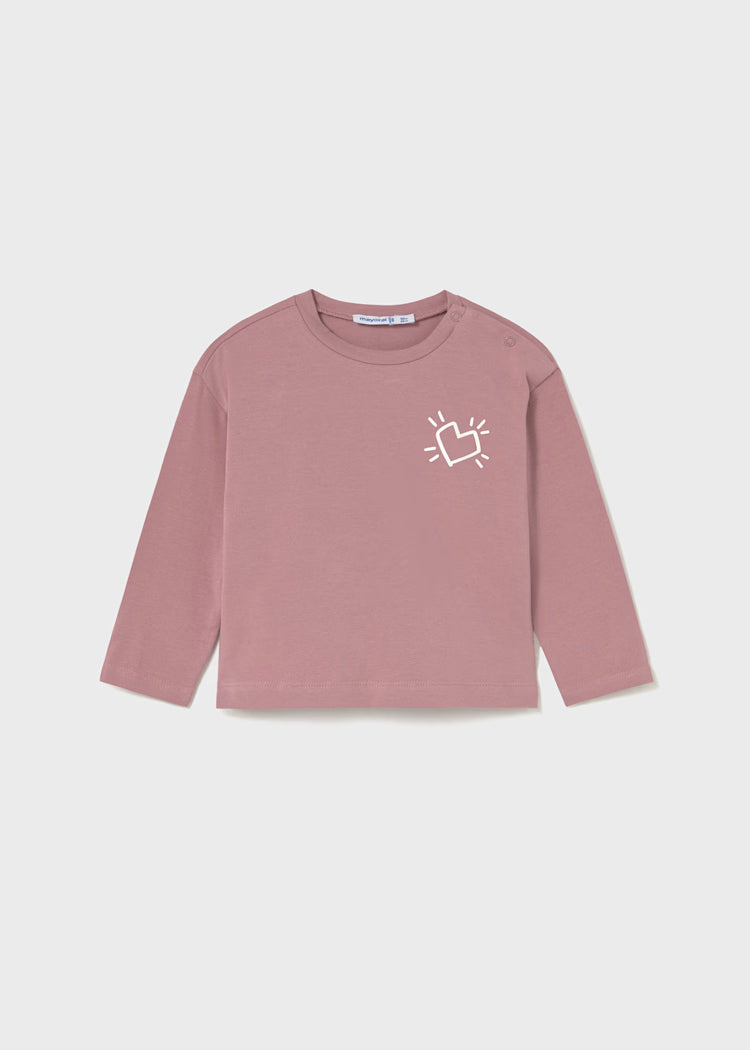 Long sleeve T-shirt for baby. Crewneck. Snap buttons on the shoulder to make it easier to put on the garment. Embellishment elements: silk-screen printing.