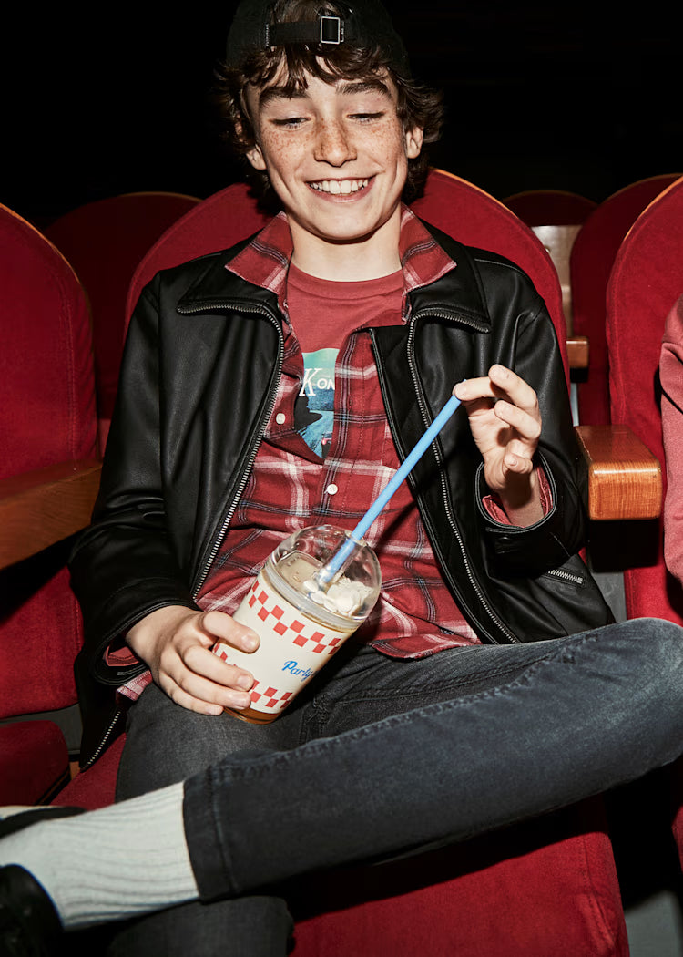 Long sleeved Jacket for boy. Shirt collar. Front, central zip fastening. Modern leatherette exterior. Pockets with zips.