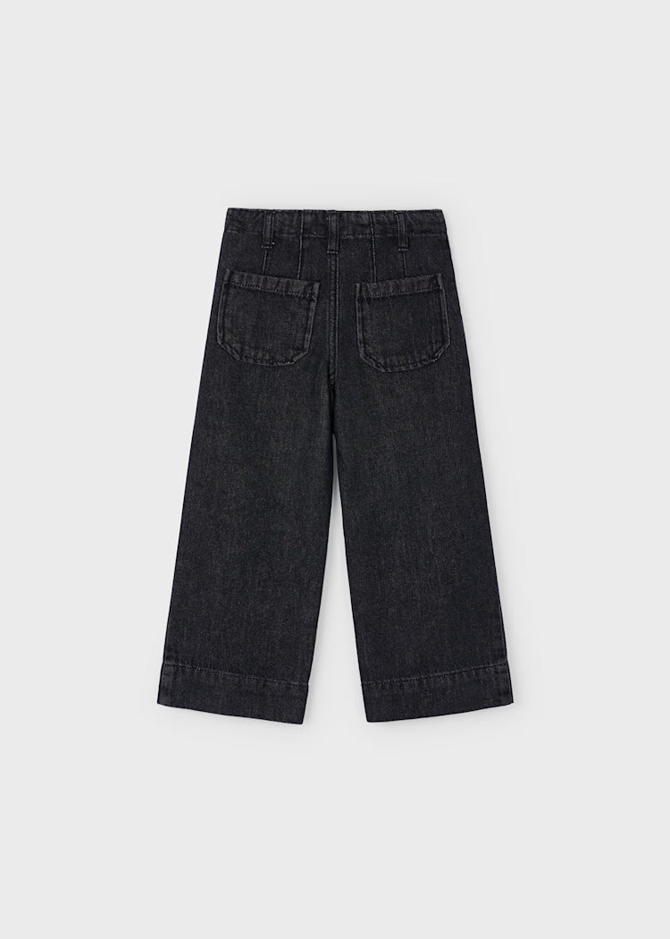 Flared style trousers for girl, wide at the bottom. Adjustable elastic with buttons on the inside of the waistband for a better fit. Made from comfortable denim fabric, perfect for everyday looks. Pleated design. Functional front pockets.