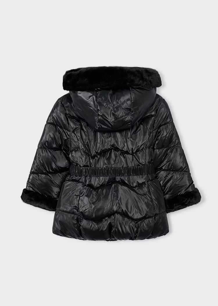 Long sleeved Coat for girl. Hood with faux fur detailing. Front, central zip fastening. Soft polyester inner lining. Metallic finish