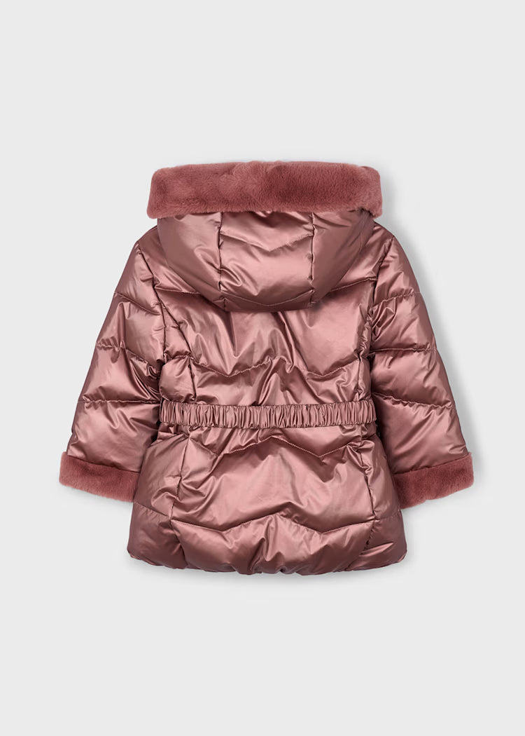 Long sleeved Coat for girl. Hood with faux fur detailing. Front, central zip fastening. Soft polyester inner lining. Metallic finish