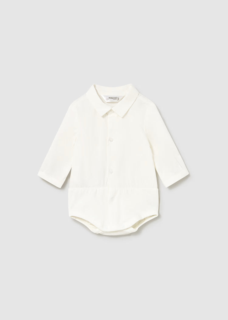 Long Sleeved Bodysuits With Buttoned Cuffs For Newborn. Shirt Collar. Snap Button Fastening At Crotch For Easy Dressing. Button Fastenings Down The Front.