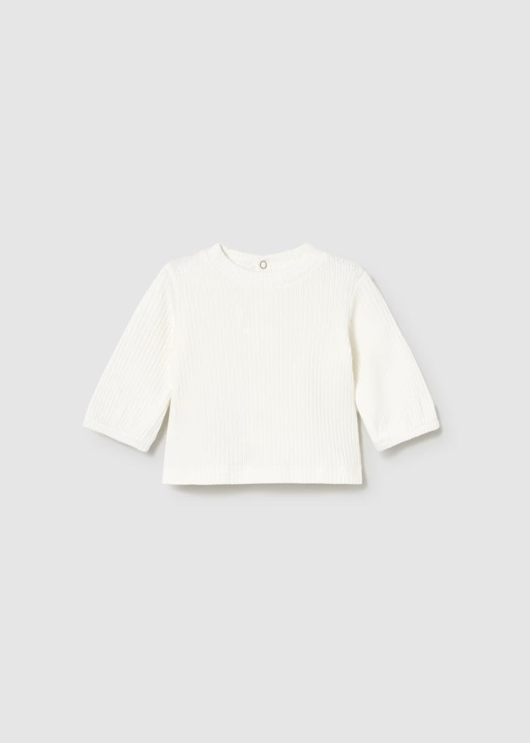Long sleeved T-shirt with elasticated cuffs for newborn. Snap button fastening at the back. Gathered design.