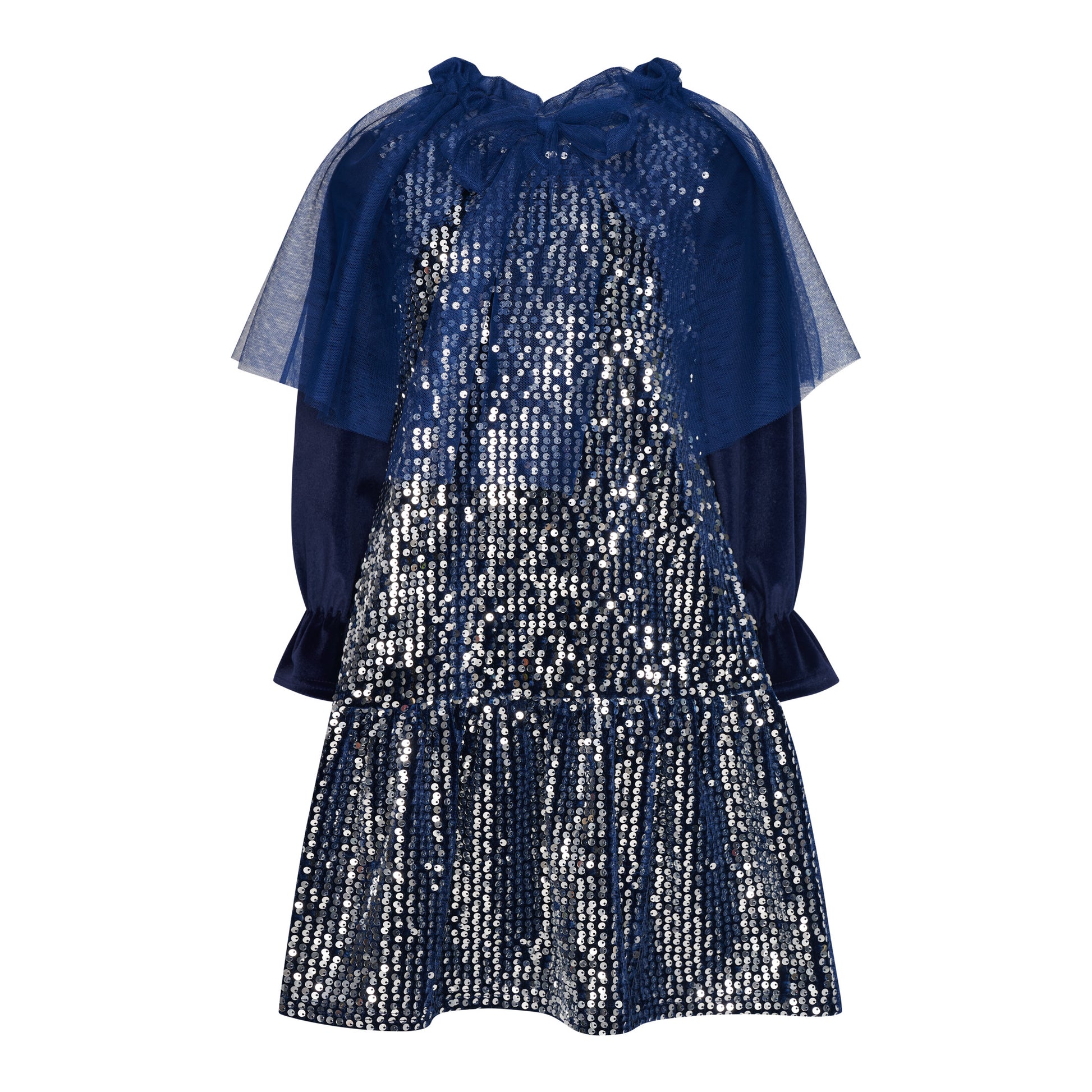 This Blue Tulle & Sequin Dress for little girls features a tulle capelet on the shoulders and sparkling sequins for a fairy-tale look. Long sleeves and a comfortable fit make it perfect for parties, celebrations, and special occasions.
