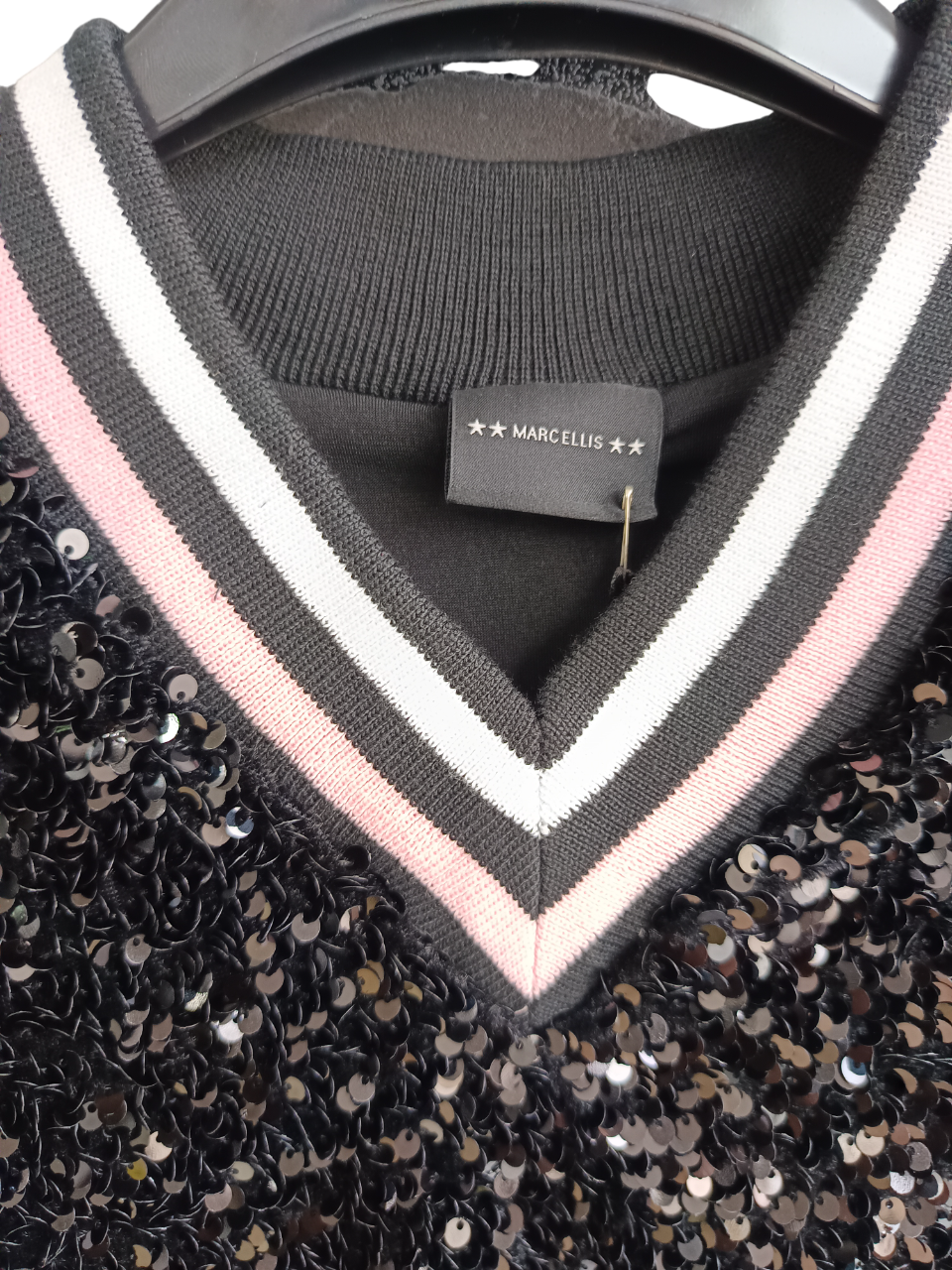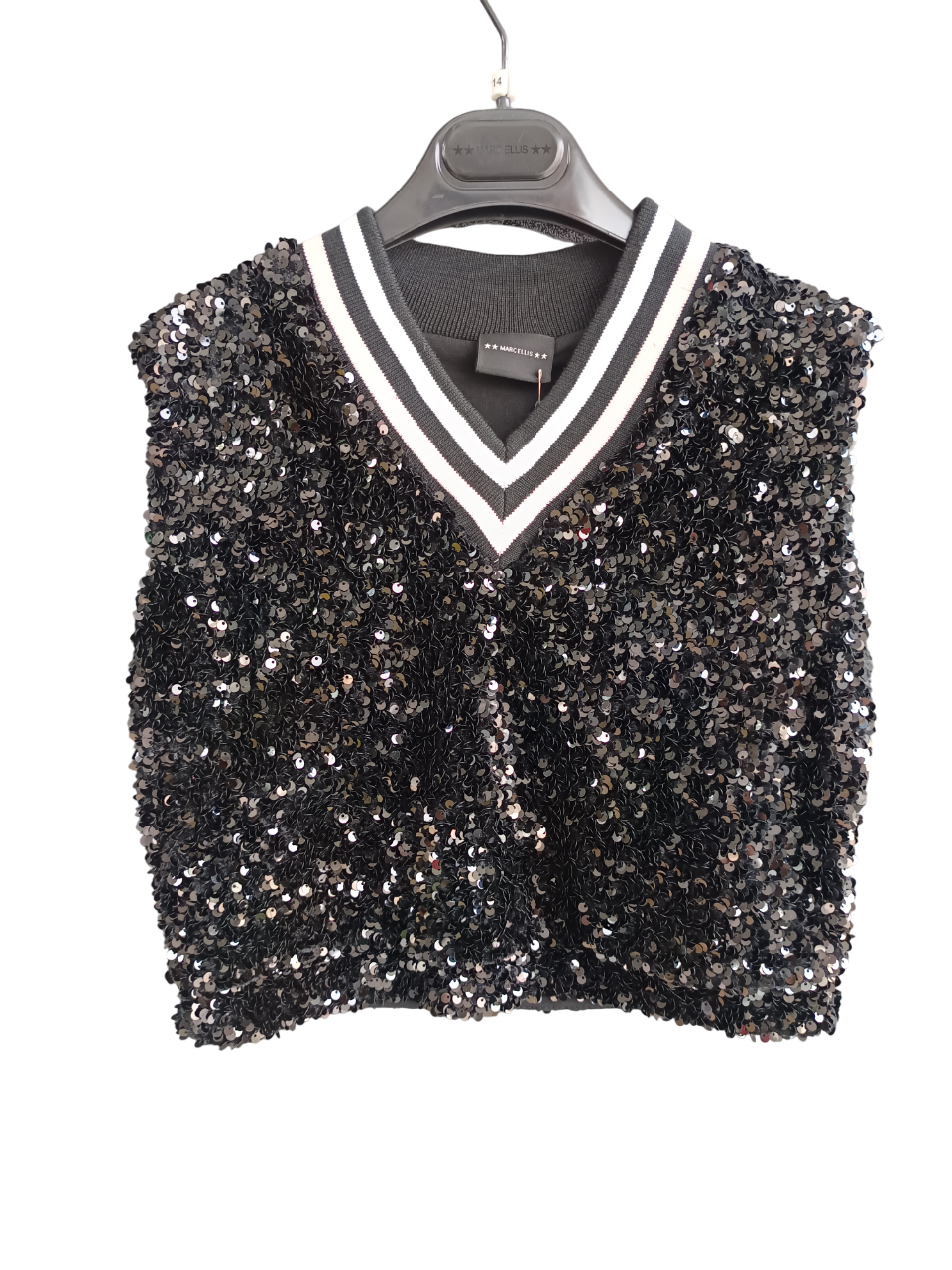 MARC ELLIS TOP - SEQUINED VEST WITH POINTED COLLAR IN STRIPED KNIT RIB