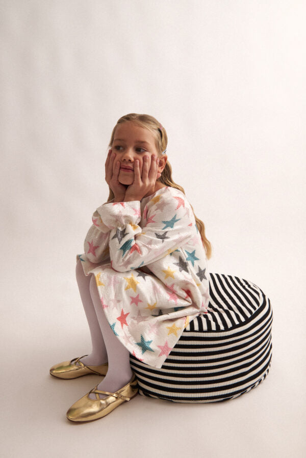 Φόρεμα από παγιέτα σε άλφα γραμμή με βαμβακερή φόδρα, print αστέρια, στρογγυλή λαιμόκοψη και διακοσμητική σούρα στα μανίκια. Κλείσιμο με κουμπιά στο πίσω μέρος. Δώρο κορδέλα με φιόγκο για τα μαλλιά.