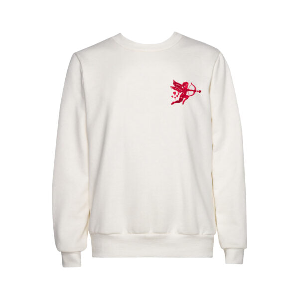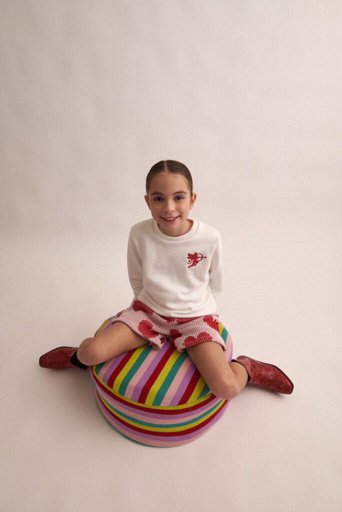 Σετ που αποτελείται από λευκό φούτερ με στρογγυλή λαιμόκοψη και κεντητό σχέδιο & πλεκτό σορτς με σχέδιο καρδιές, εσωτερική βαμβακερή επένδυση και λάστιχο στη μέση. Δώρο κορδέλα για τα μαλλιά.