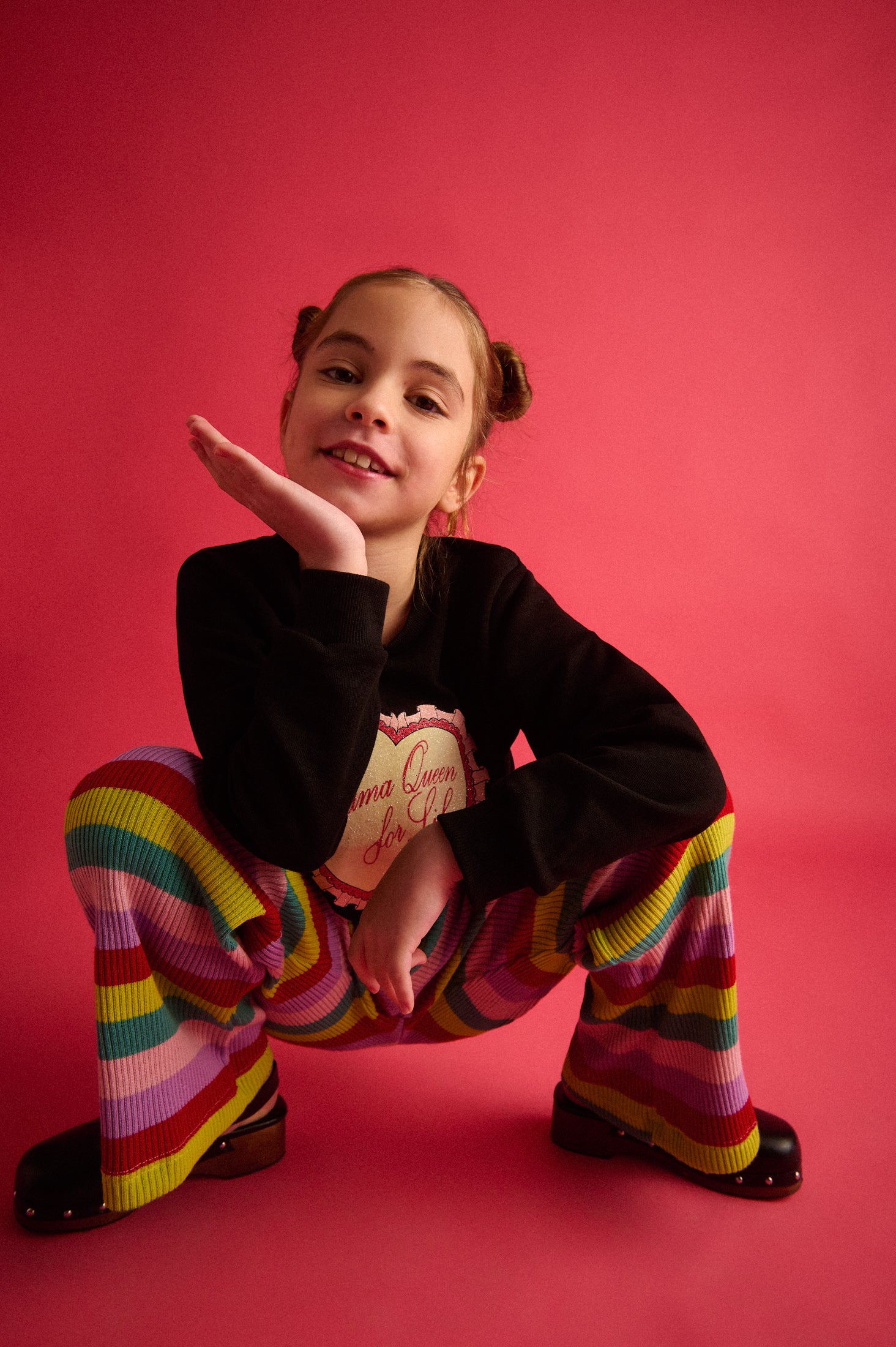 Create a stylish and cozy look with the Rainbow Set by Two in a Castle! Featuring a detailed print on the top and knitted striped pants, this set adds a playful dimension to her everyday outfit.